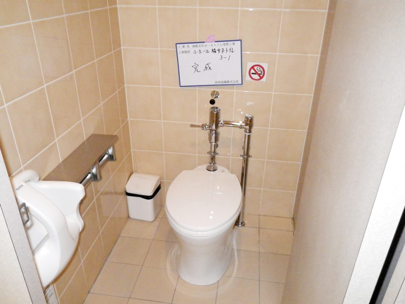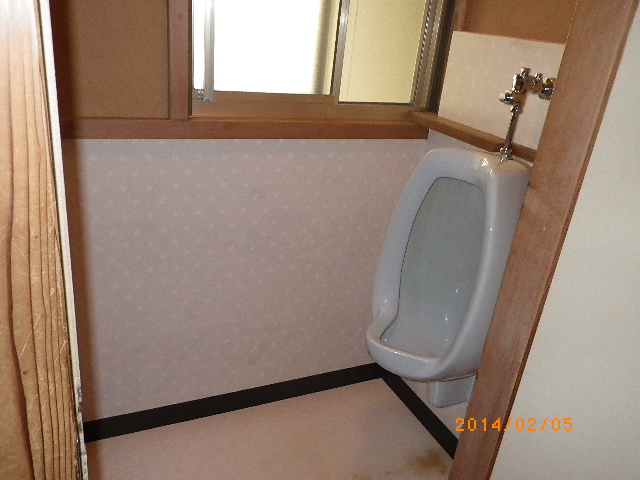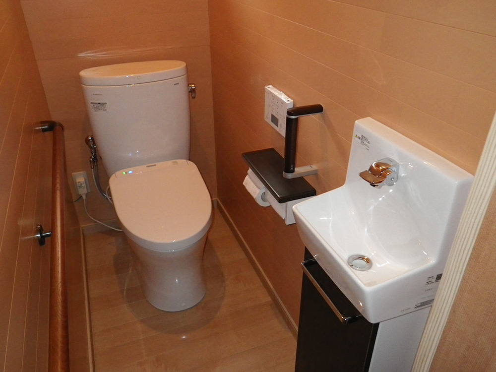 合併浄化槽の導入に伴い、トイレ内も全面改装することに。今までのトイレは、約1坪のスペースに大便器スペースの個室と小便器スペース、さらに手洗い器があり、使い勝手も悪くお掃除も大変とのことで、今回はワンルーム化し小便器を撤去、広々とした空間を確保し車椅子でも利用できるようにしました。また将来のことを考えて長い手すりとひじ掛けタイプの手すりをつけました。