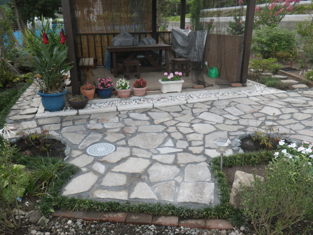 白浜町に住むAさん宅のお庭で石の乱張りを依頼されました。乱張りに使用した石はブルガリア産ソフィアストーン(片麻岩)という硬質な石です。約10㎡の施工で工期は2日間でした。