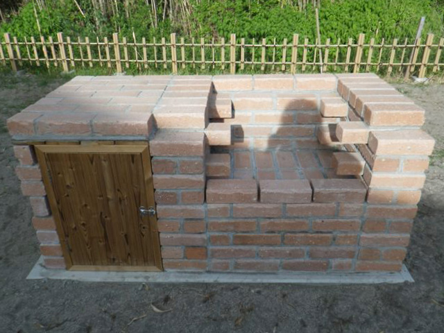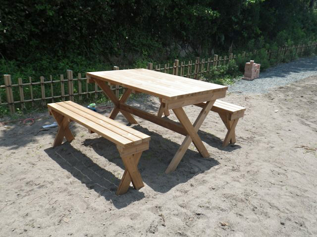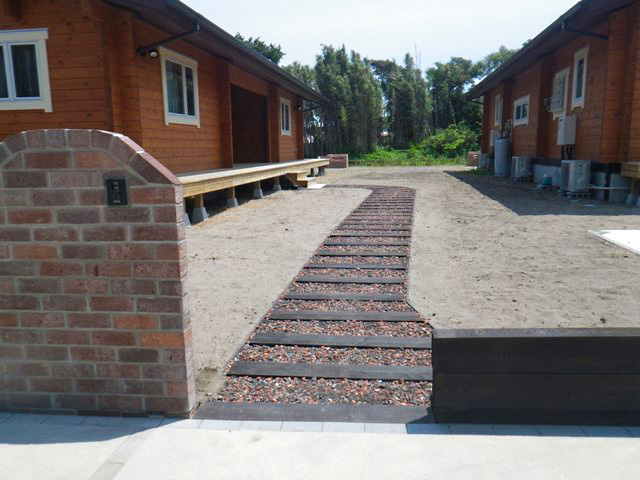 駐車場からのアプローチ、バーベキューコンロやテーブルセットもオリジナルの手作りです。